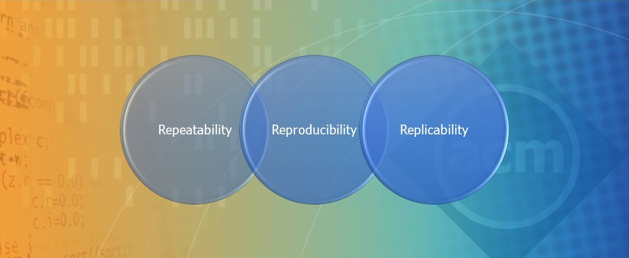 - Replicability. An independent group can obtain the same result using artifacts which they develop completely independently.